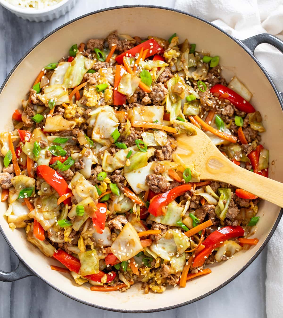 This Cabbage Stir Fry is one of my all-time favorite stir fry recipes. The amazing homemade sauce is the star of the show, but it’s also a fantastic way to make great use of a lot of cabbage! I love the ground beef/pork combination in this recipe, and the bell peppers and carrots add the best flavor and texture. Serve this with rice or noodles and you’ll have it made!