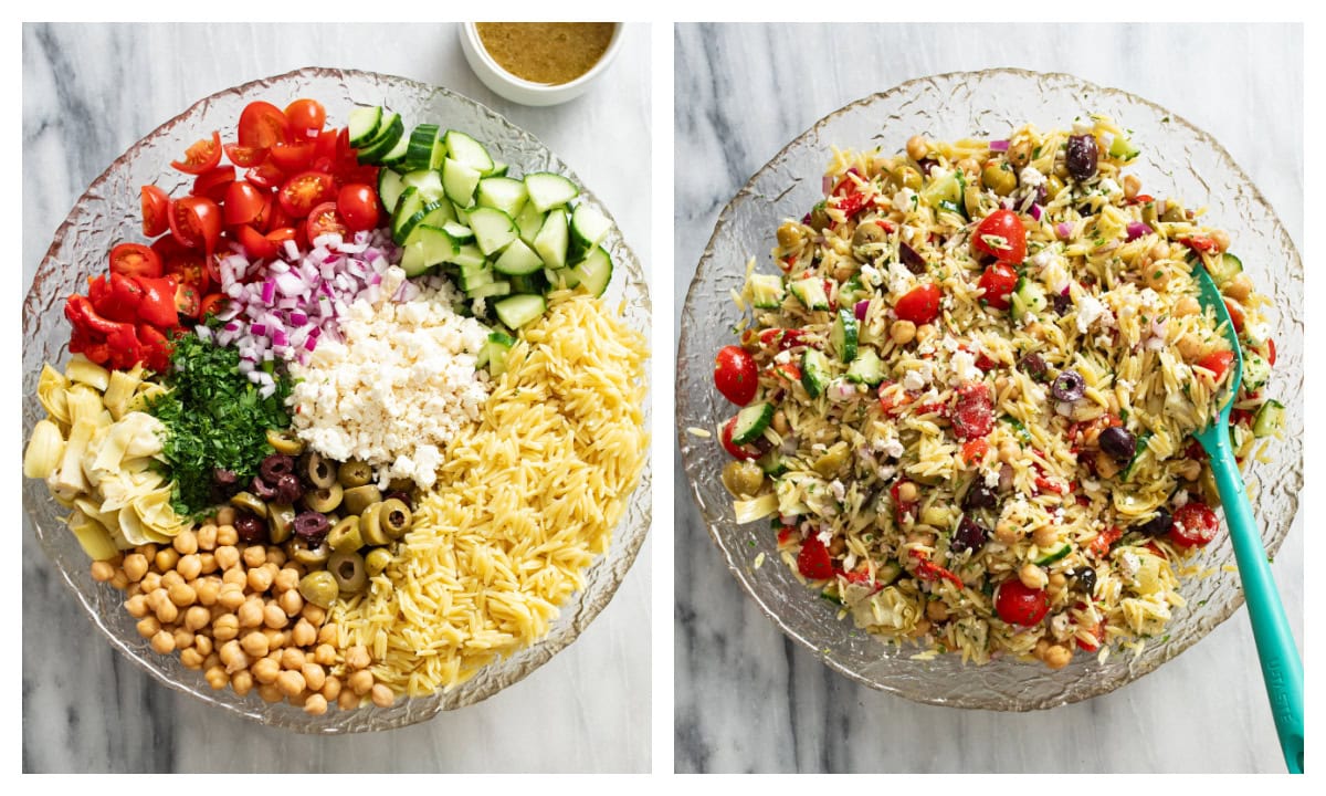 - Combine the cooled orzo and additional salad ingredients in a large bowl and toss with dressing. If possible, chill for 1-2 hours prior to serving.